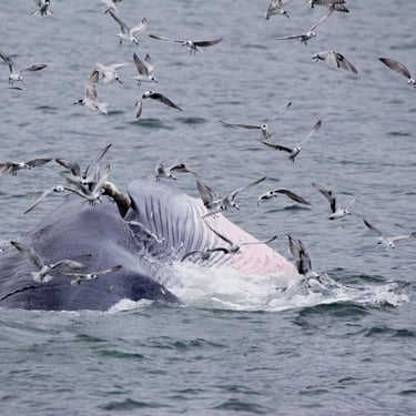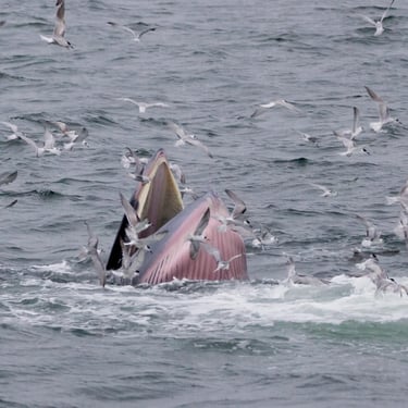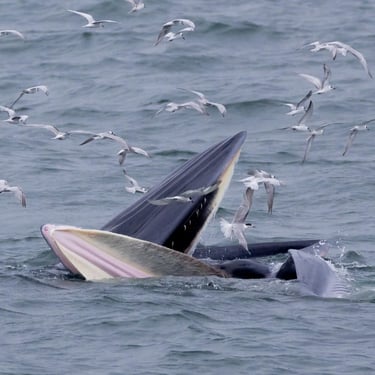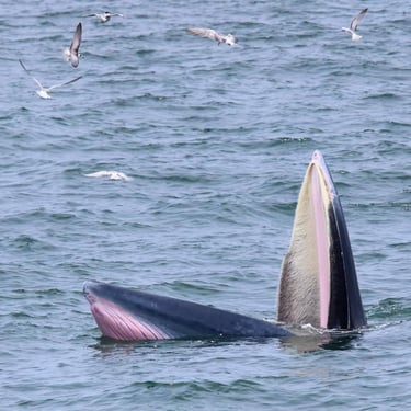 Spot Bryde whales as they surface and feed. The guide will explain whale behavior, marine ecology, and conservation efforts.