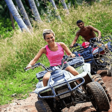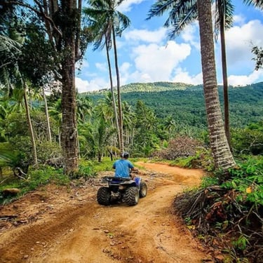 Visit jungle to experience ATV extreme tour through remote mountain trails, shade of the coconut palms in Samui island
