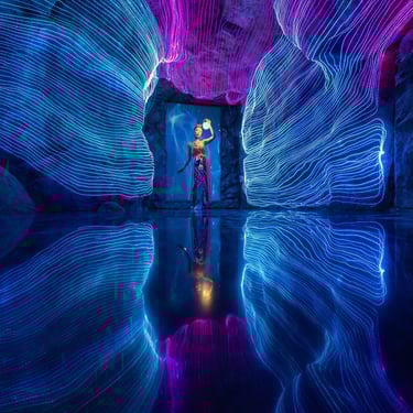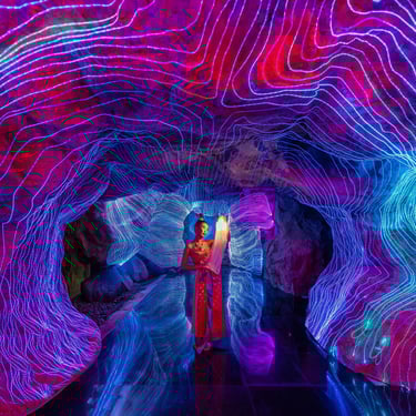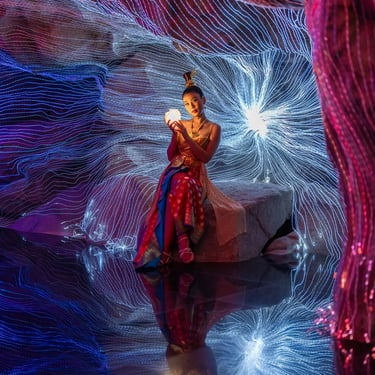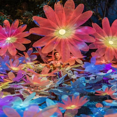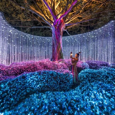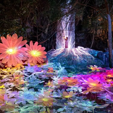 Immersive experiences with interactive art, symbolic flowers, and mythical creatures